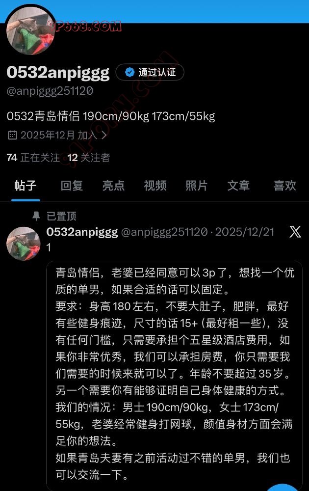 要求:身高180左右,不要大肚子,肥胖,最好有些健身痕迹,尺寸的话15+(最好粗一些),没有任何门槛,只需要承担个五星级酒店费用,如果你非常优秀,我们可以承担房费,你只需要我们需要的时候来就可以了。年龄不要超过35岁。另一个需要你有能够证明自己身体健康的方式。